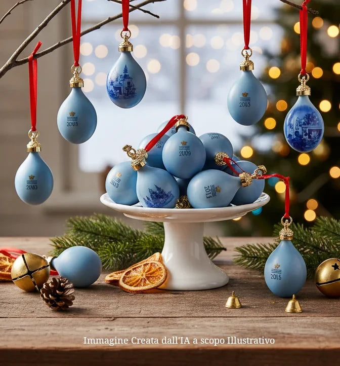 Nota per il Collezionista: Ogni pezzo (alto circa $8\text{ cm}$) è decorato con il medesimo motivo iconico del Piatto di Natale Royal Copenhagen di quello stesso anno, rendendoli perfetti per completare la serie del Piatto annuale. A differenza delle Gocce B&G, sulle Gocce Royal Copenhagen il motivo è visibile solo su un lato, mentre sul retro sono incisi l'anno e le famose tre onde del marchio.
